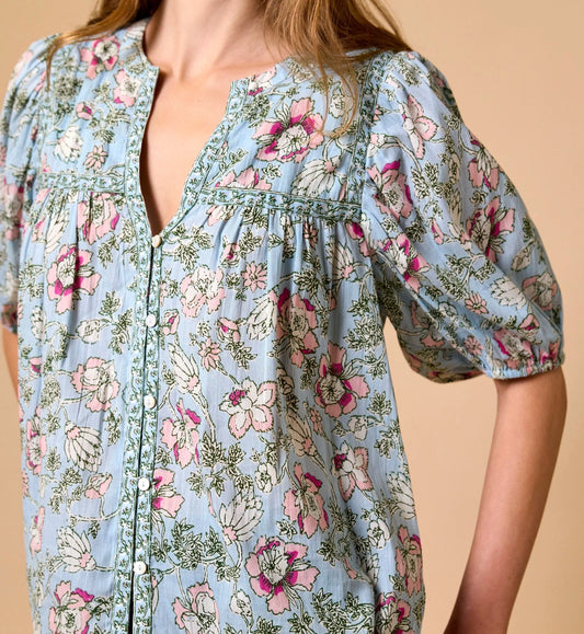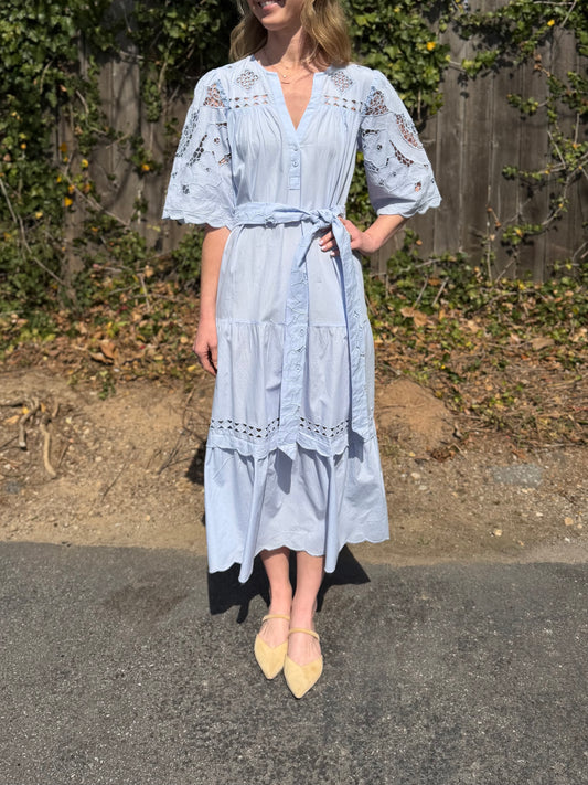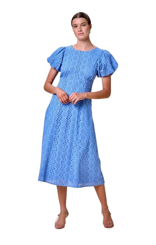 Dahlia Flower Embroidered Dress in blue by Rose & Rose