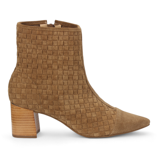 Henrietta Woven Suede Bootie in caramel by Bruno Menegatti