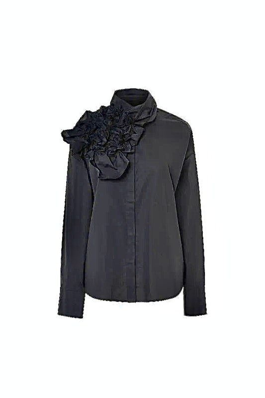 Long Sleeve Flower Accent Poplin Top in black by Psophia