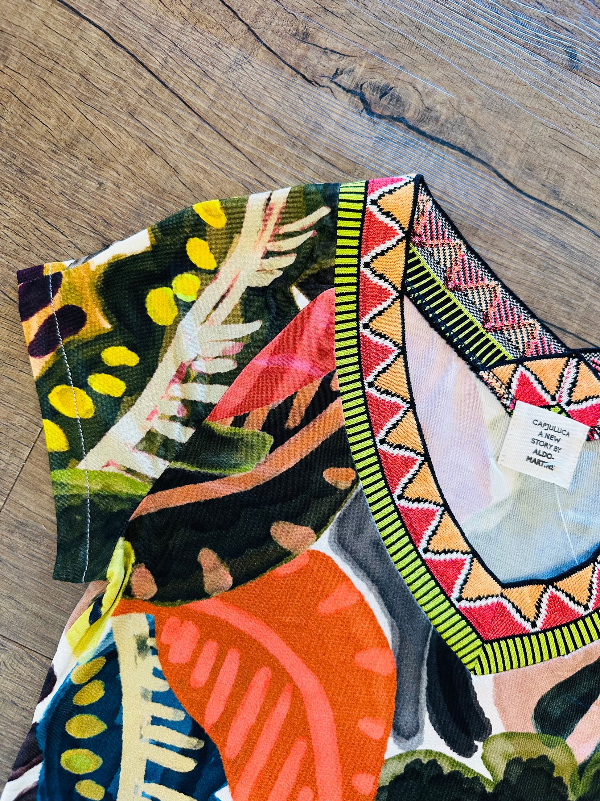 Elevate your wardrobe with this sophisticated short-sleeve top by Aldo Martins, featuring an eye-catching abstract print in rich marron tones. The woven geometric V-neck detail adds refined structure and visual interest, making it an effortless statement piece. Pair seamlessly with the Abstract printed midi skirt for a cohesive, polished ensemble that transitions beautifully from day to evening. Perfect for those who appreciate contemporary design with understated elegance.