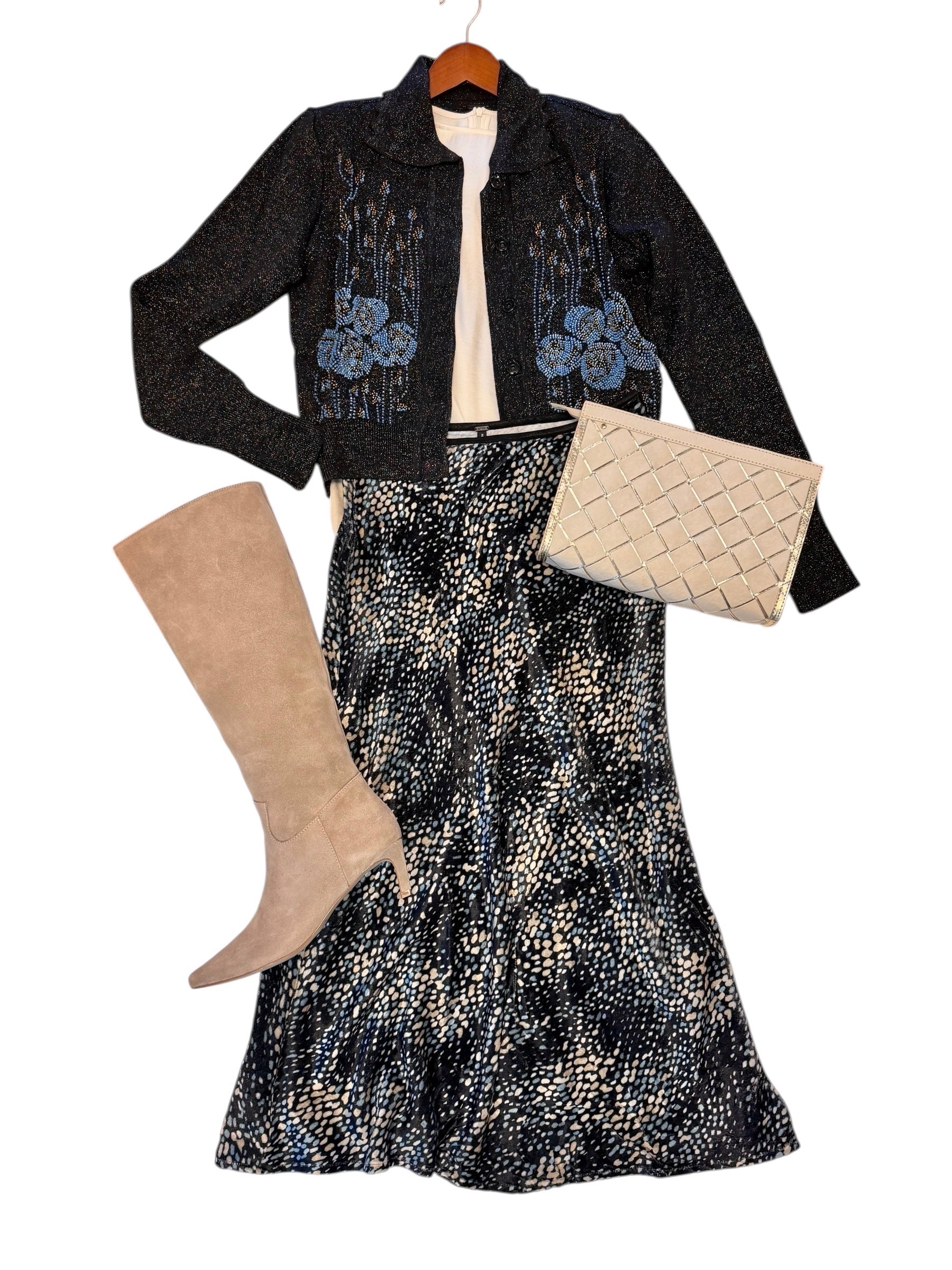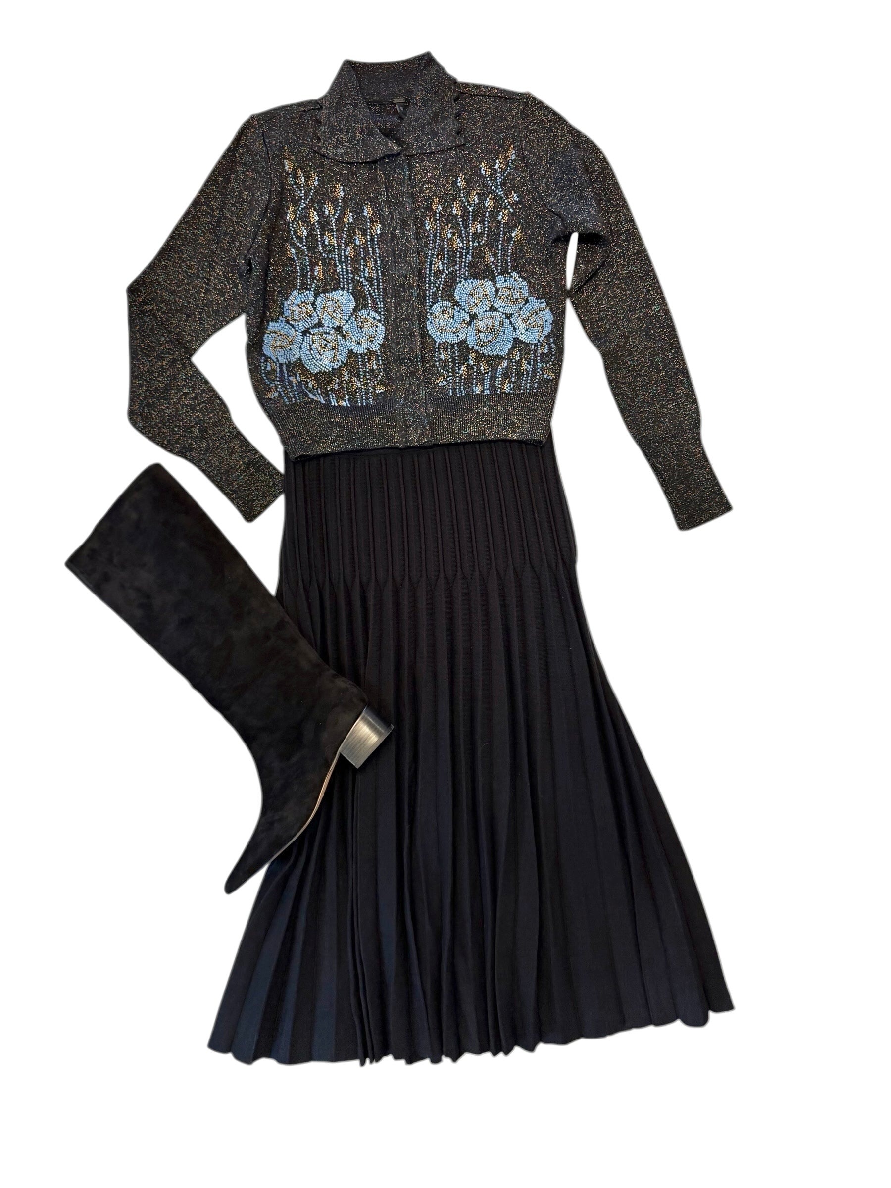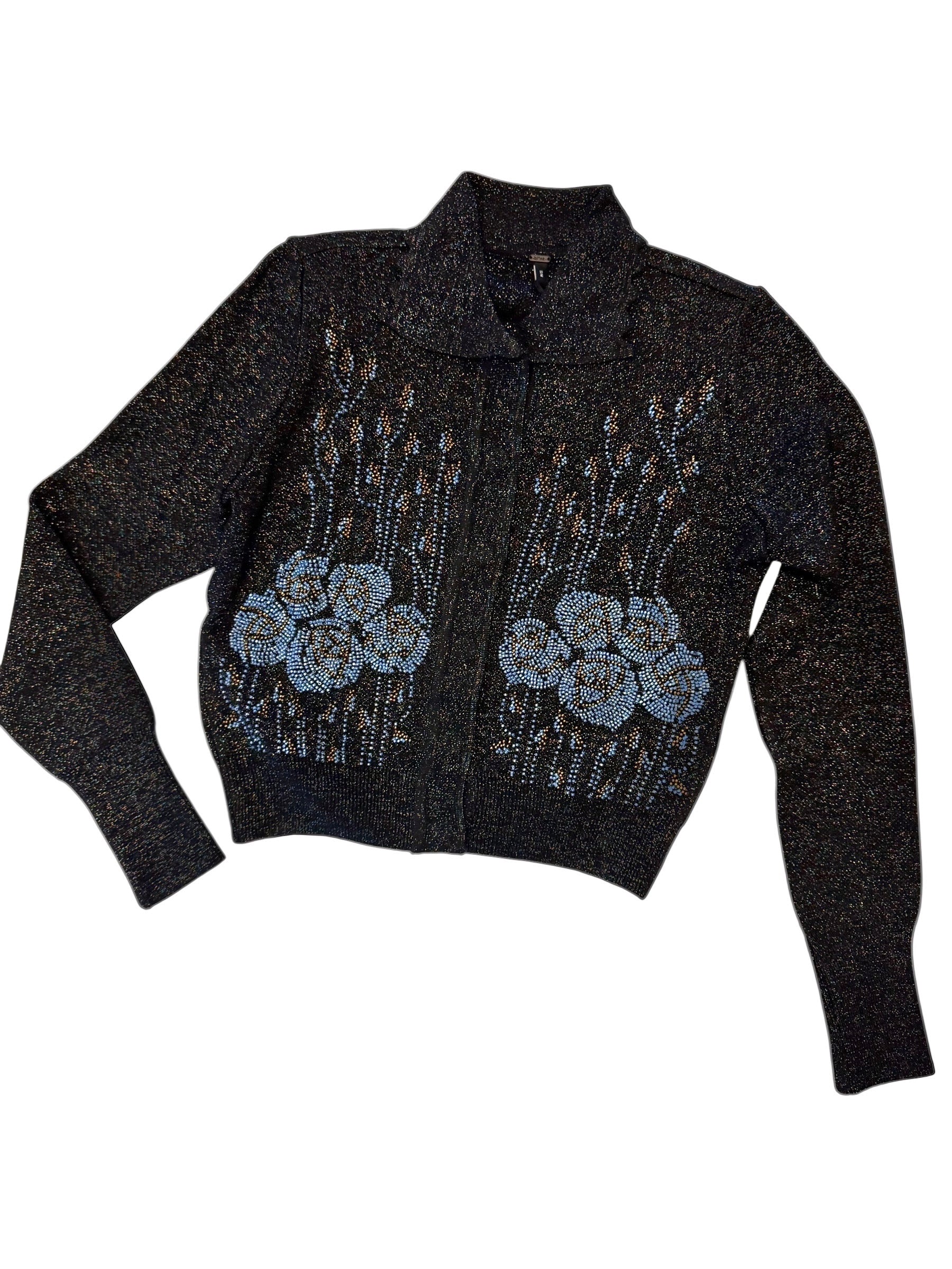 Unleash your inner fashionista with the Aceline Embellished Sweater. With its snap front collar and intricate beaded and lurex details, this black sweater is versatile and perfect for any occasion. Dress it down with jeans or dress it up with a satin or velvet skirt for a holiday-ready look. Elevate your style with Blank London.