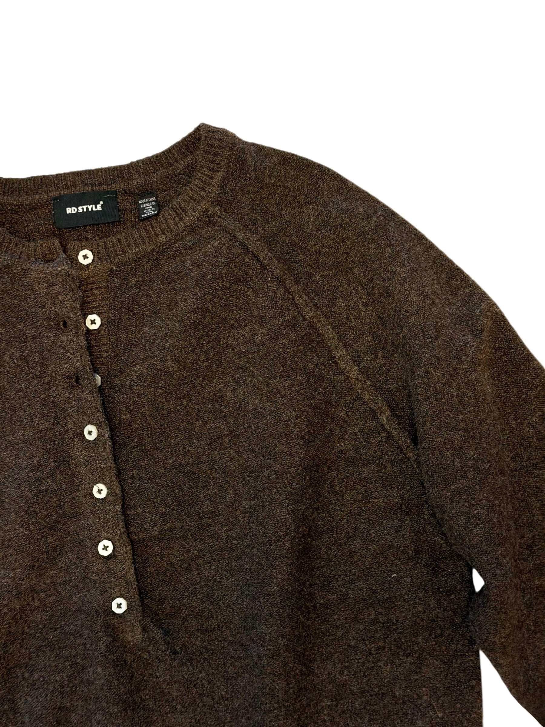 Pick up! This henley's calling your name... Our RD Style Akleja Henley Pullover Sweater has just the right amount of detail to keep her standing out from the rest. Reverse stitch and cute buttons, this piece is better than your average brown sweater!
