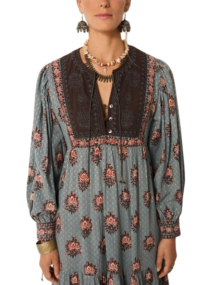 A darker yoke grounds the field of roses, anchoring the fall of fabric. The contrast adds clarity to fluid movement.