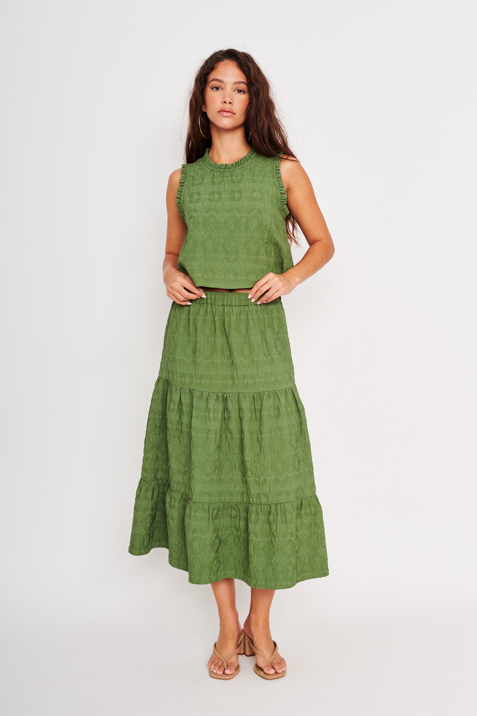 The Aviana Top in green by dRA features delicate ruffled band details at the armholes and neckline, adding an elegant touch to this boxy, relaxed silhouette. Cut for effortless comfort, it pairs beautifully with the matching Maya skirt for a coordinated, refined look. Perfect for those who appreciate understated sophistication with thoughtful design details.