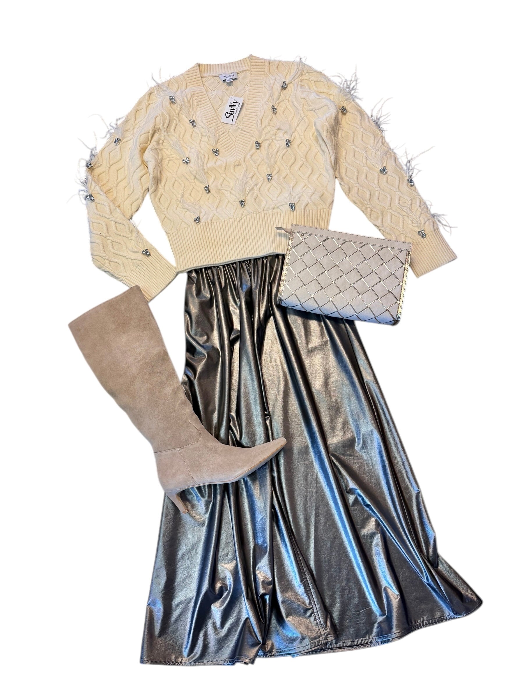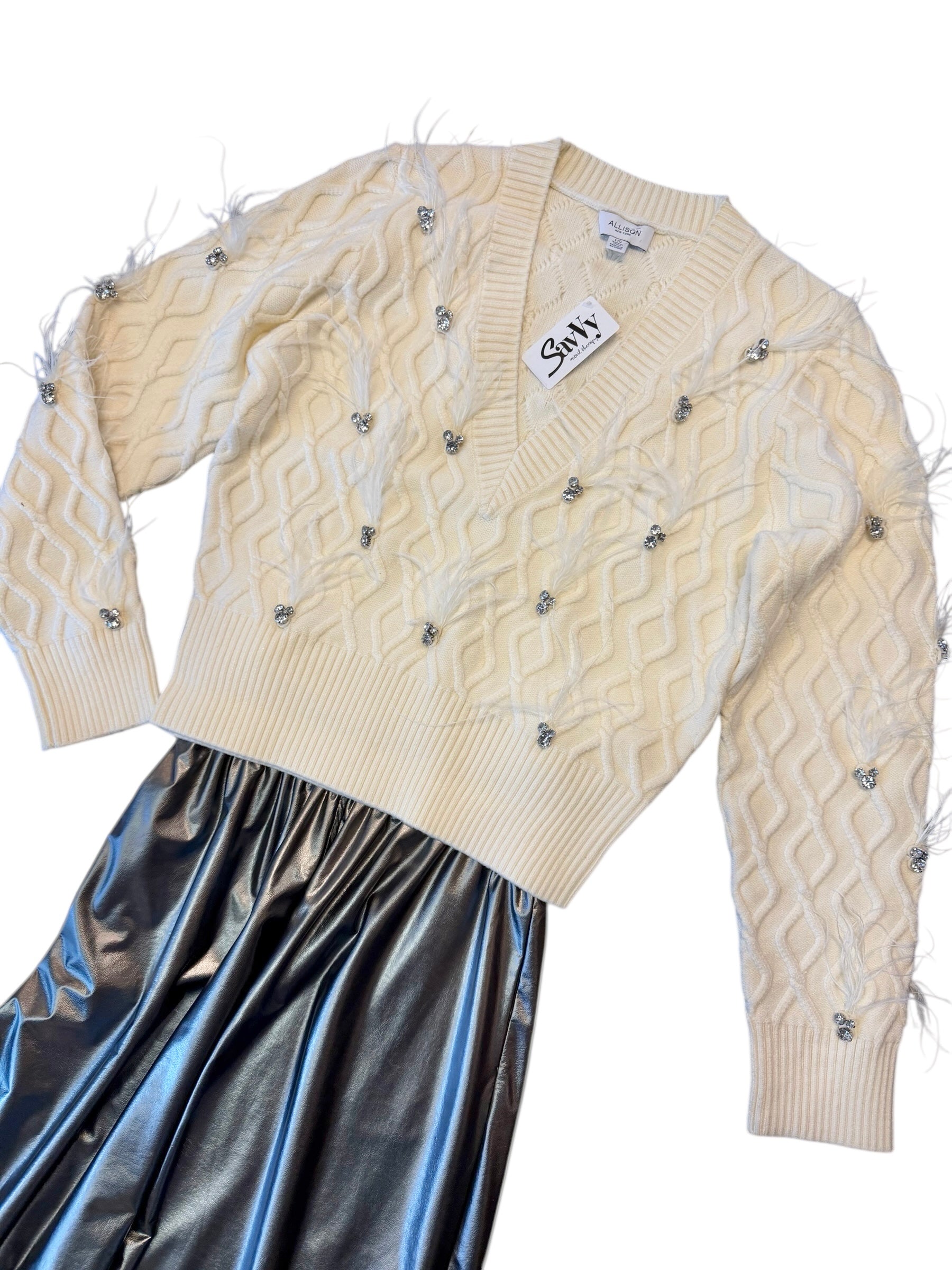 The Briar Sweater is a showstopper for a night out in the chilly temps. Features a deep v neckline and a tapered in style through body. Clusters of rhinestones and real ostrich feathers are scattered throughout the body and sleeves.