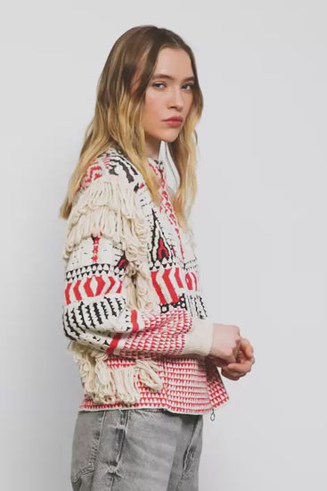 Make a statement in this bold red print sweater jacket, where playful fringe details dance along the edges for extra flair. The dual zipper design gives you styling flexibility, while strategically placed pockets keep your essentials close. Whether you're heading out for adventure or just want to add some personality to your everyday look, this textured beauty delivers both fun and function.