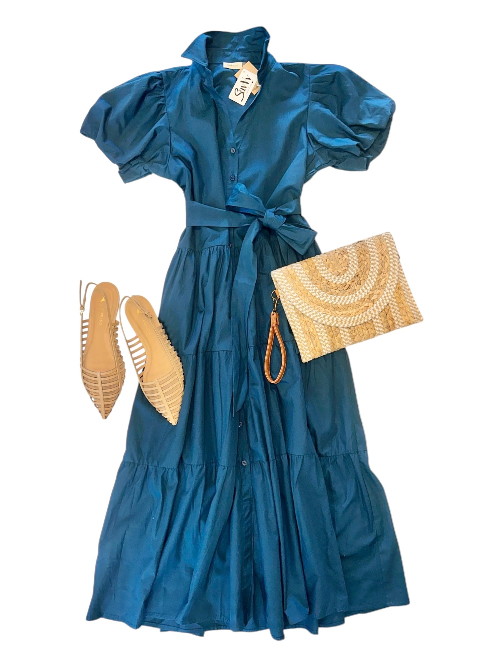 This solid Clara Maxi Dress in midnight features whimsical bubble sleeves and a tiered skirt that dances with every step. A button-up front adds charm, while the optional sash lets you customize your silhouette. Perfect for turning heads with effortless style.