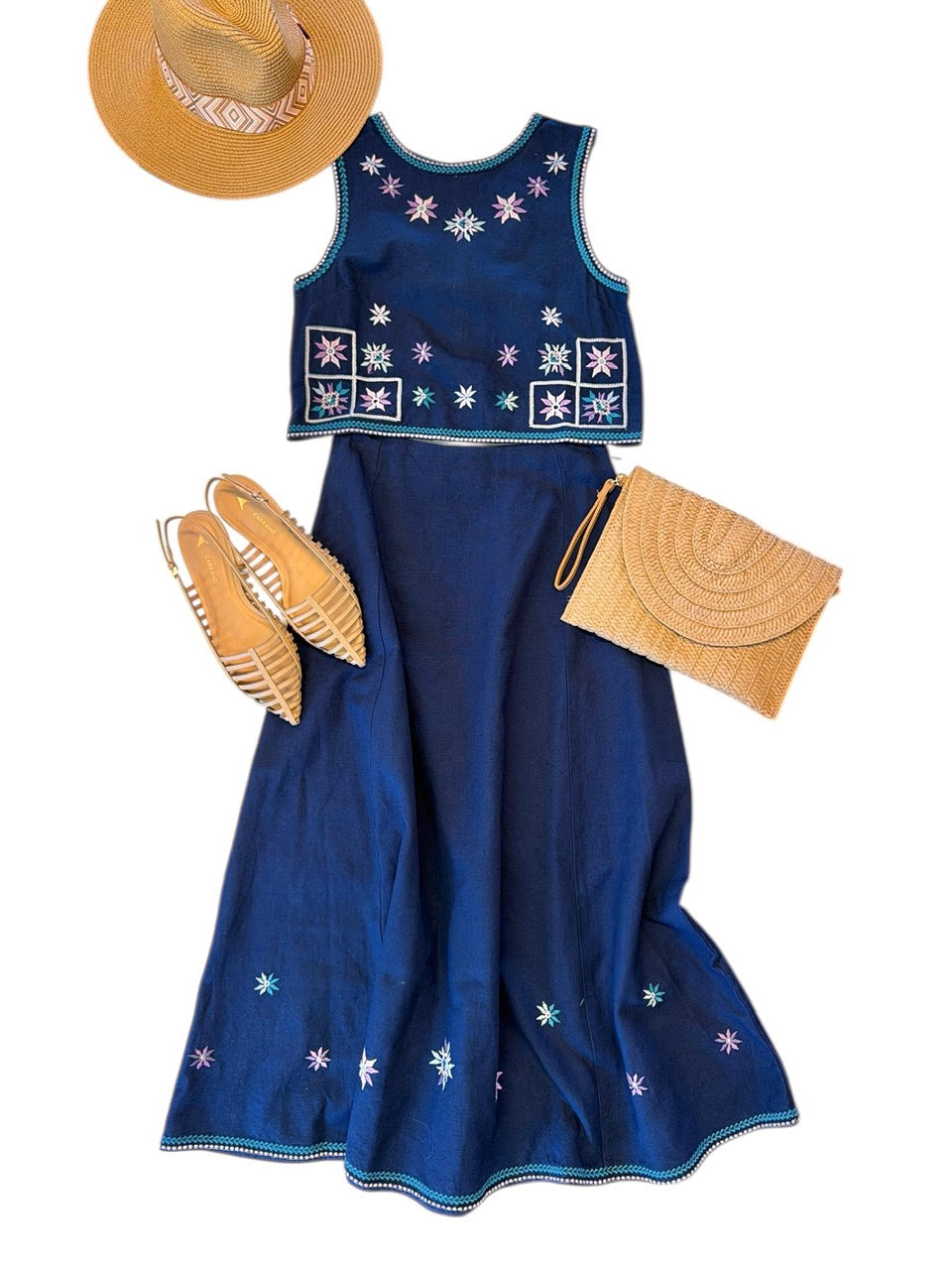 Elevate your wardrobe with the Dafne Canvas Skirt, a beautifully crafted piece by Louise Misha. Made from premium cotton canvas and linen blend, this skirt features a fitted bodice that gracefully flows into a flared silhouette. Delicate floral embroidery adorns the bottom hem, while subtle seam detailing adds visual interest. The discreet side zip ensures a seamless fit. Perfect paired with the matching top for a coordinated, effortless look.