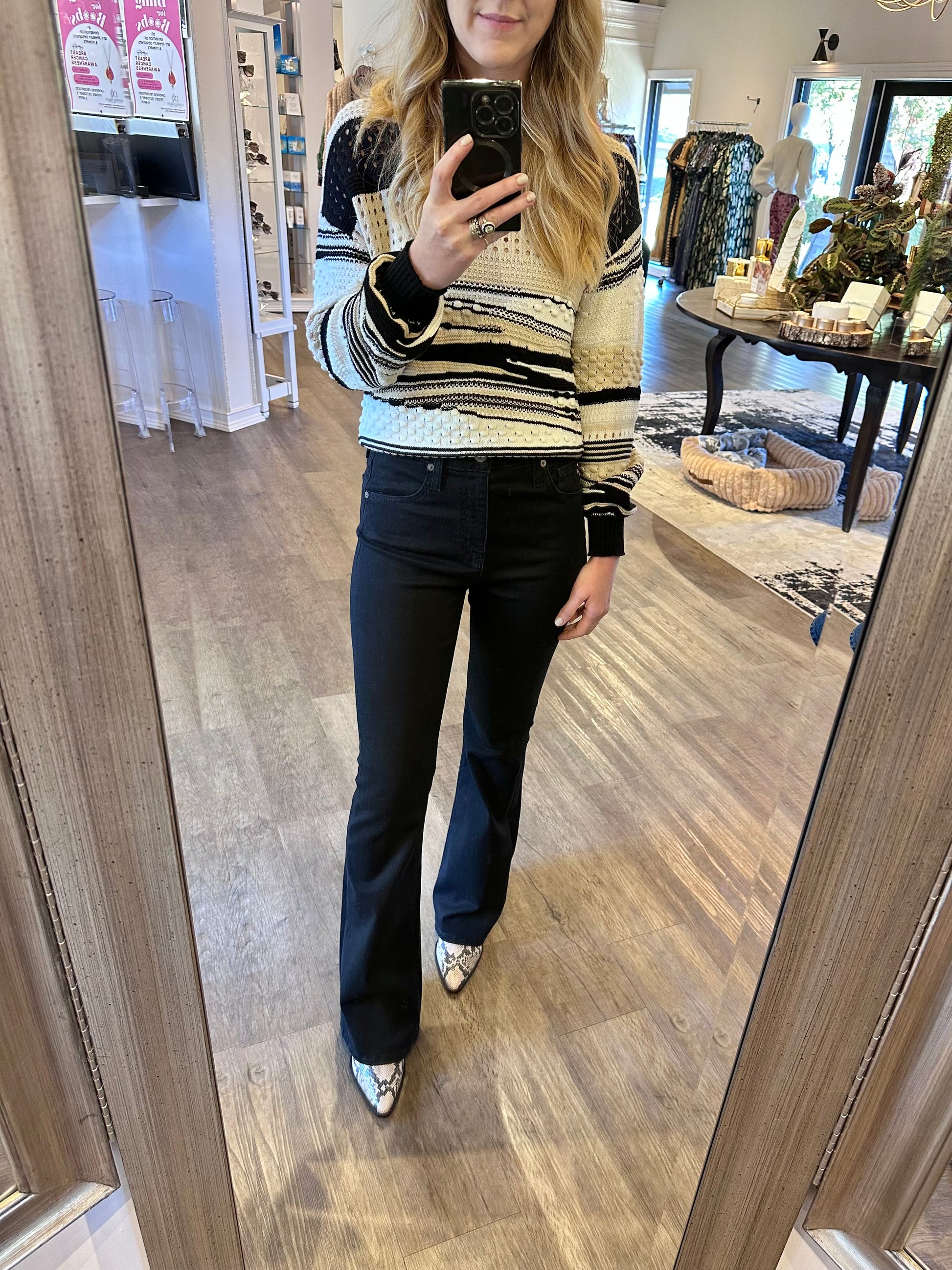 The Farrah Boot is a mid-rise bootcut jean featuring a deep, dark shade of black. Cut from 9 oz. True Vant Denim with figure-flattering stretch, the pair sits right at the natural waist and has a skinny fit through the legs before opening into a subtle flare at the hems.