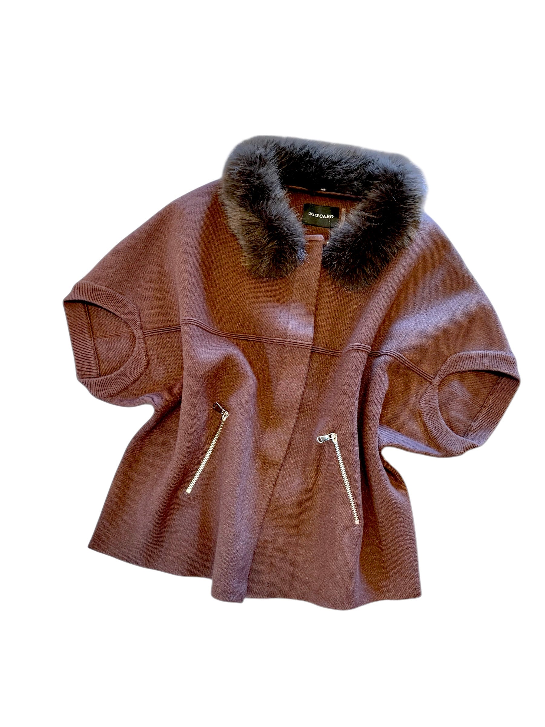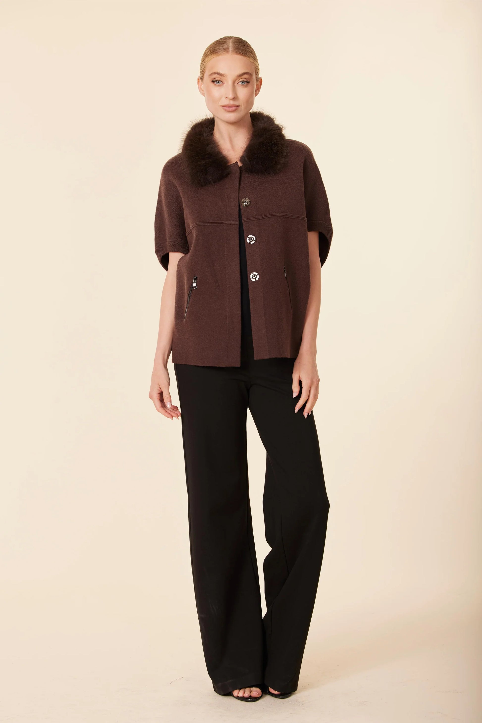Faux Fur Trimmed Cardigan Poncho in espresso by Dolce Cabo