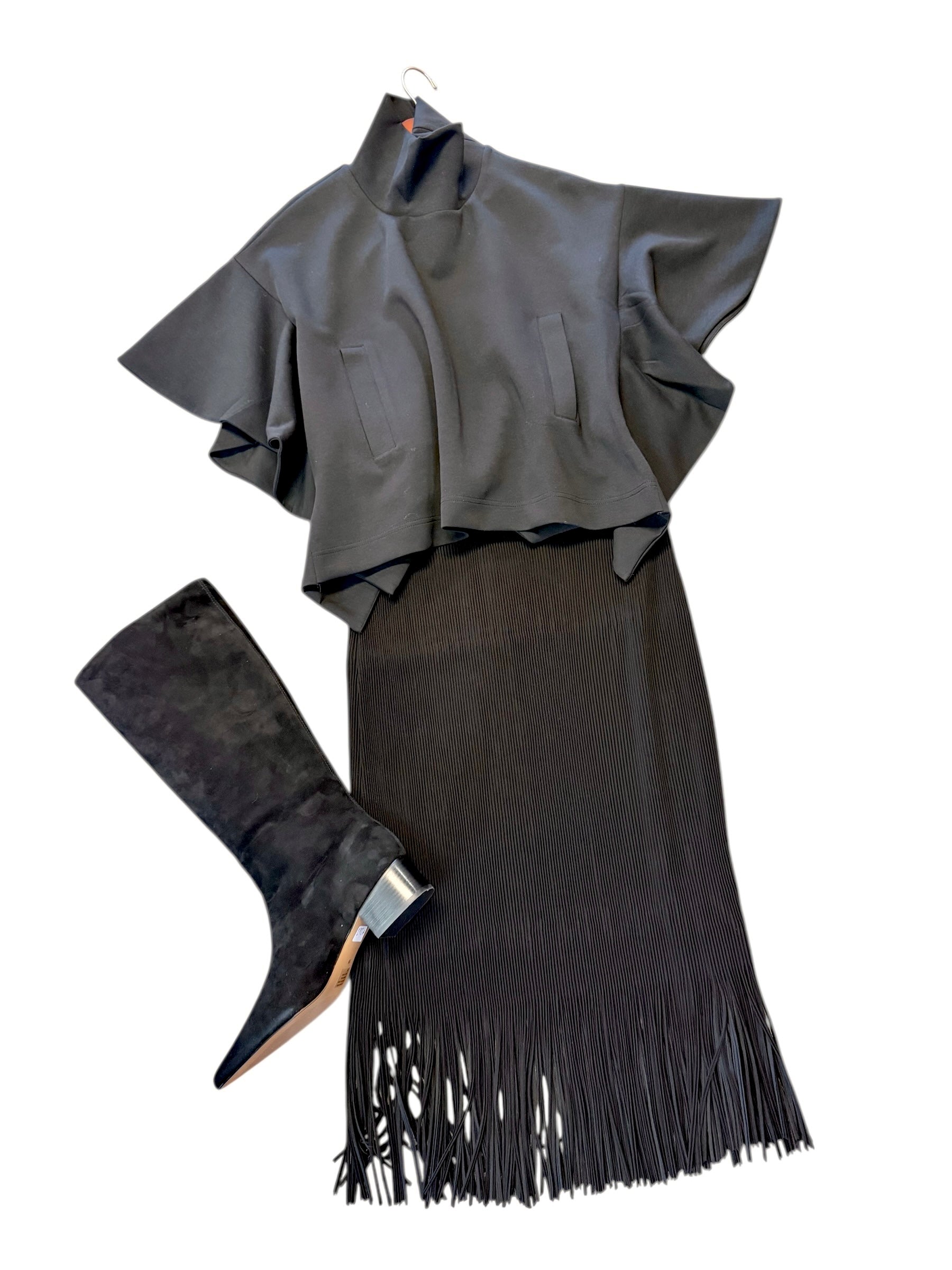 Step out in style with the High Neck Scuba Poncho Top in black by Psophia. The smooth scuba fabric drapes effortlessly, creating a chic, flowy silhouette that’s as comfortable as it is striking. Its high neck adds a dash of sophistication, while the poncho shape brings a playful twist to your wardrobe. Perfect for layering or wearing solo, this top makes every outfit effortlessly cool.
