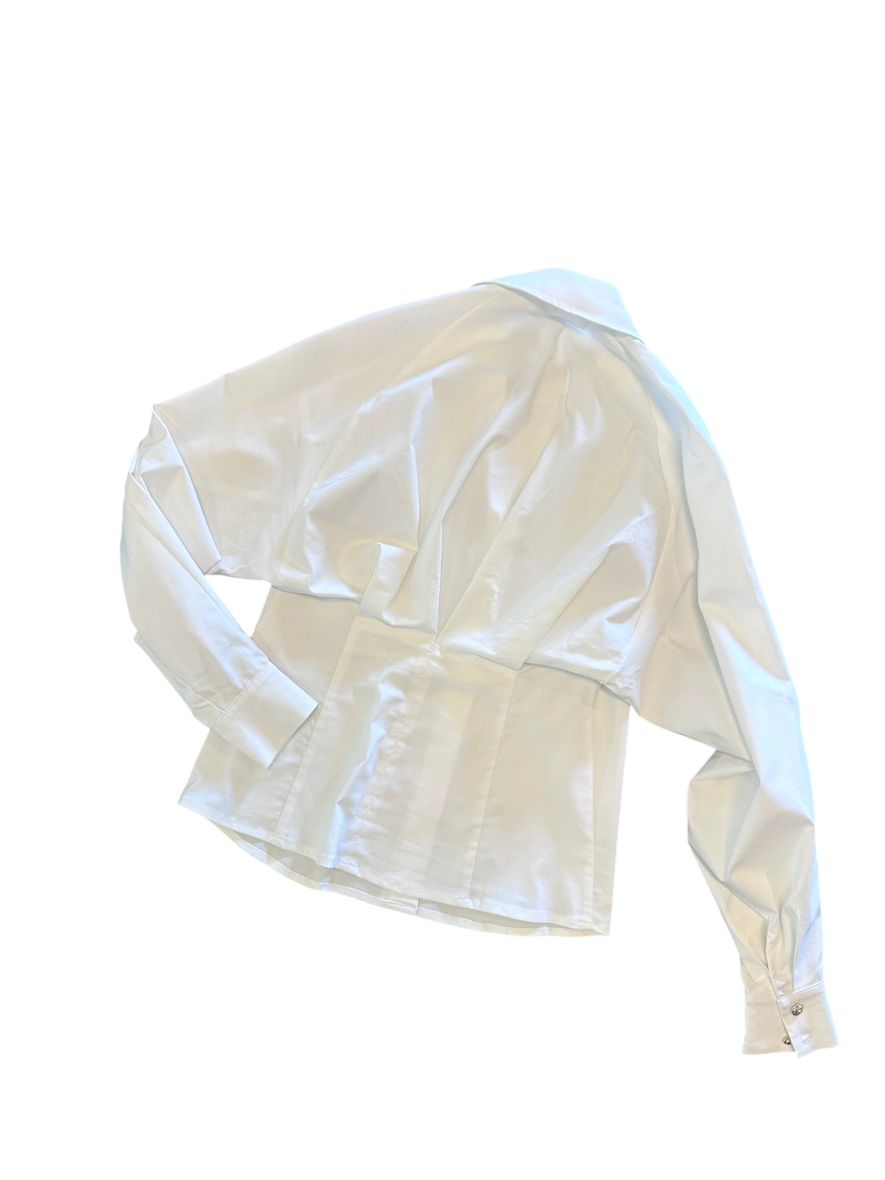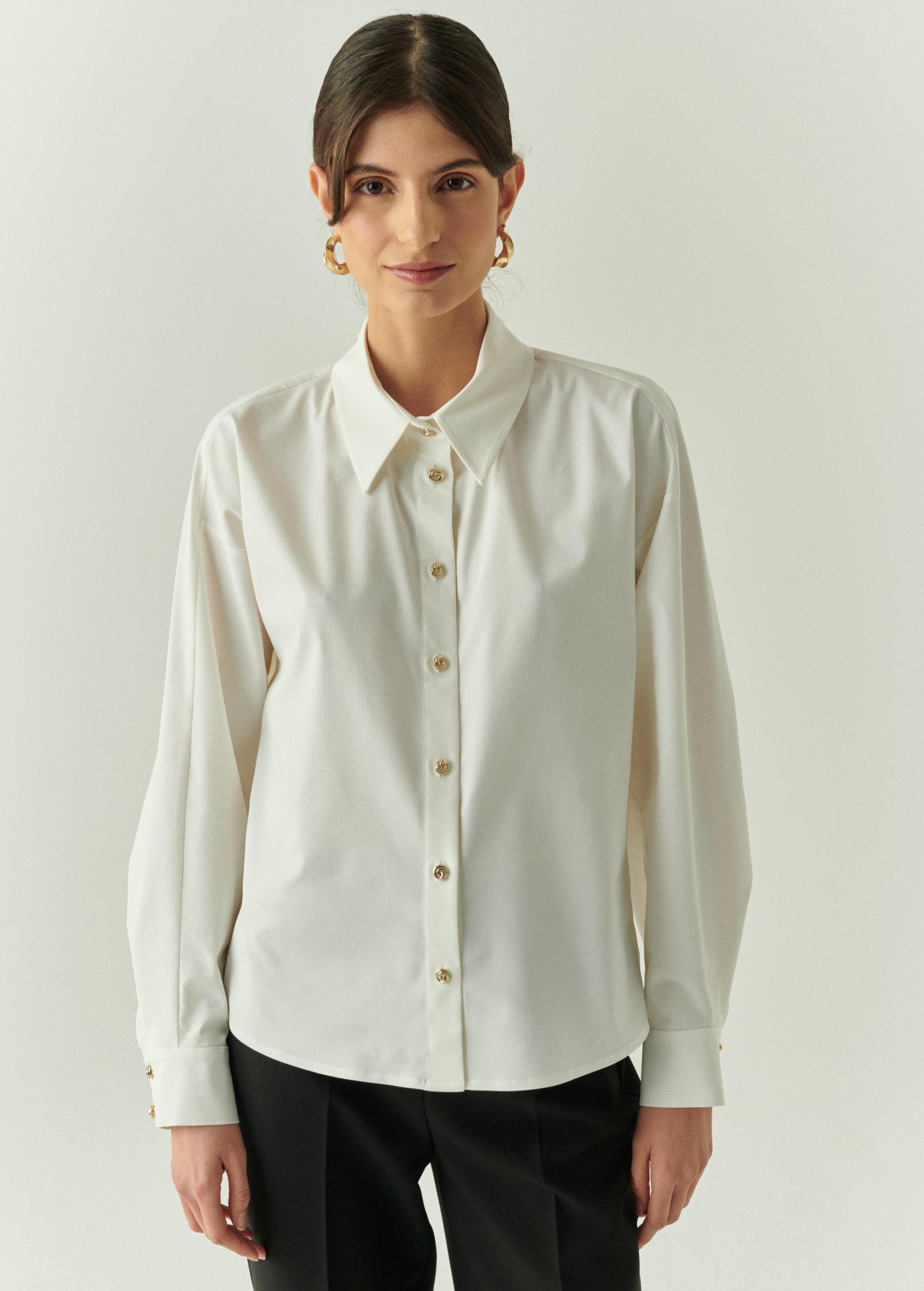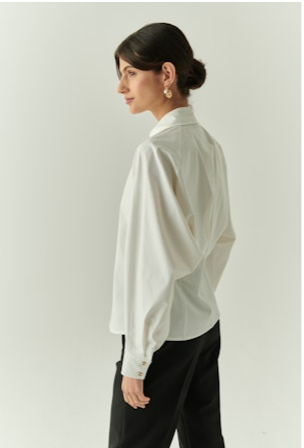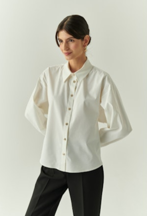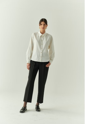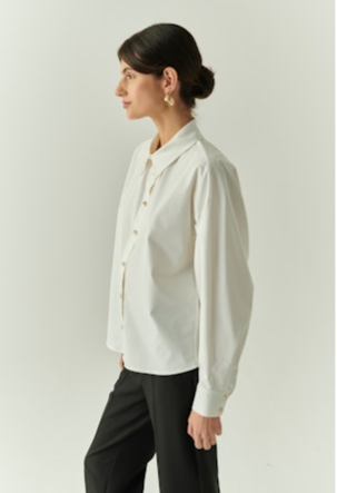 A modern neutral, perfectly structured. The gold button detail and darting at back, of the Kamari Shirt, offers the same refined silhouette but with a little twist. Clean lines and subtle stretch add to its appeal.