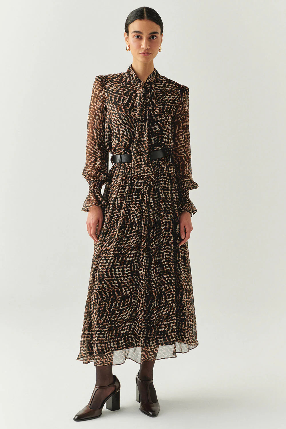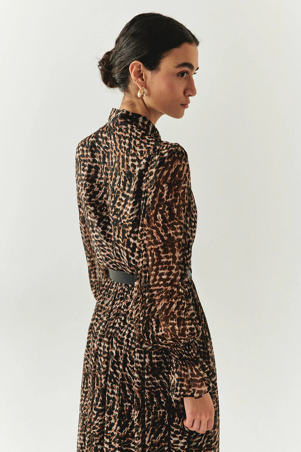 The Kara Blouse offers a high neckline and sheer long sleeves with a bold, textural print—designed to layer or stand alone. Wear tucked into sleek pants or with jeans for elevated contrast.