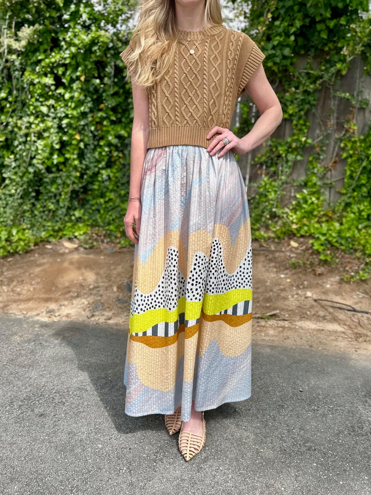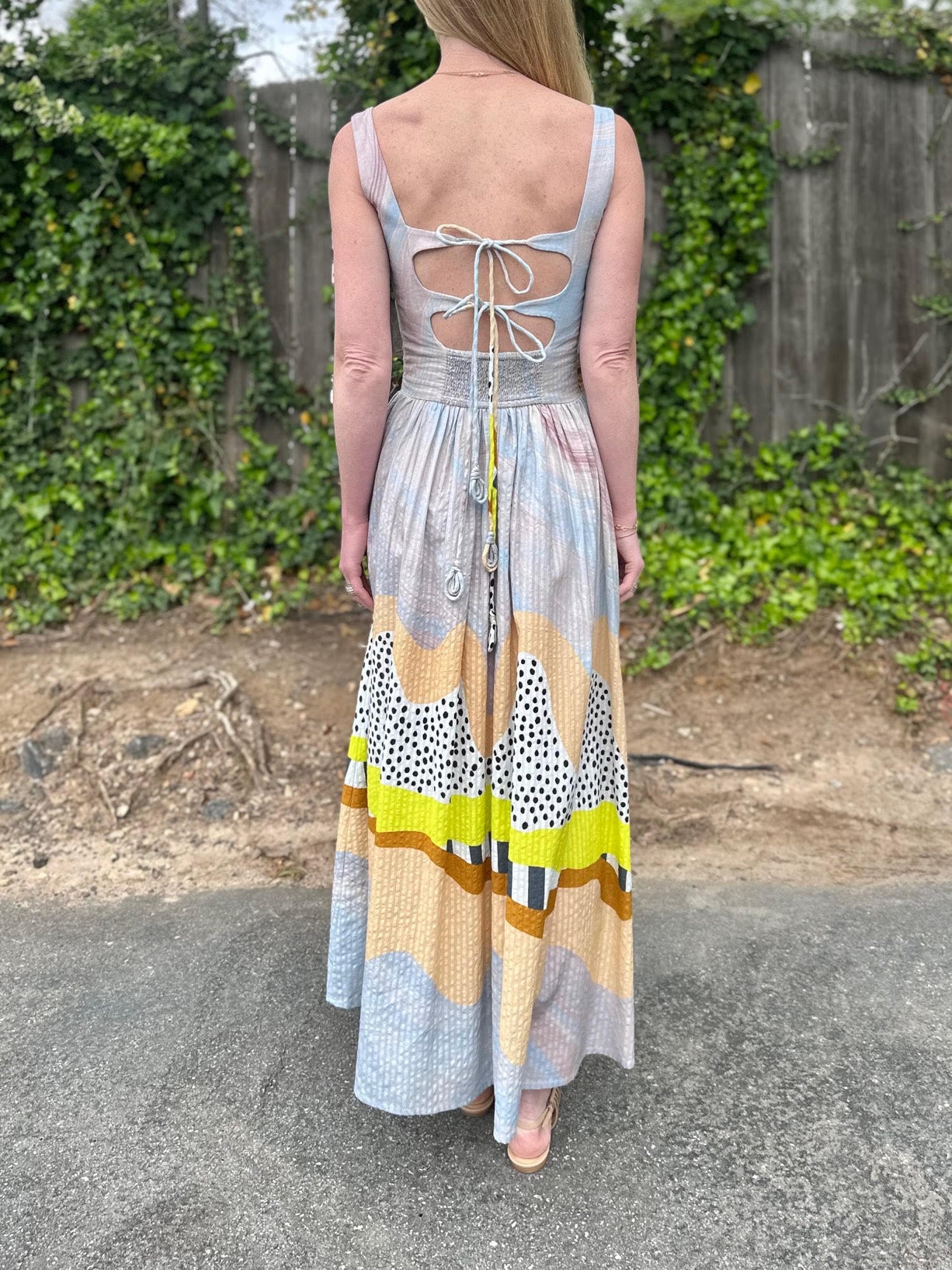The Lakelynn Dress in Cotton Candy by Conditions Apply is a playful maxi dress with a square neck and tie back, perfect for a fun and flirty look. The seersucker fabric adds a unique touch to this dress, making it a standout piece in any wardrobe.