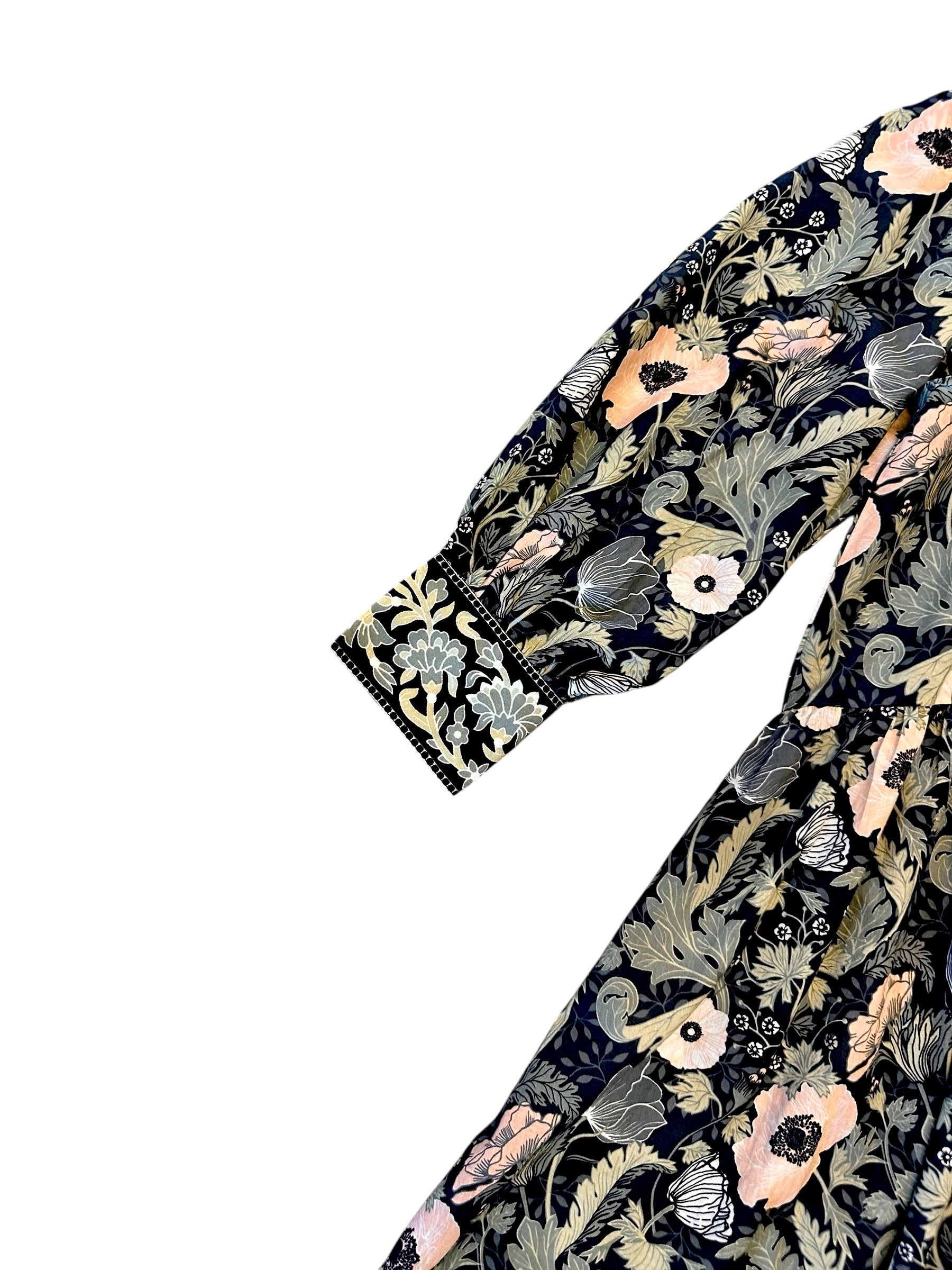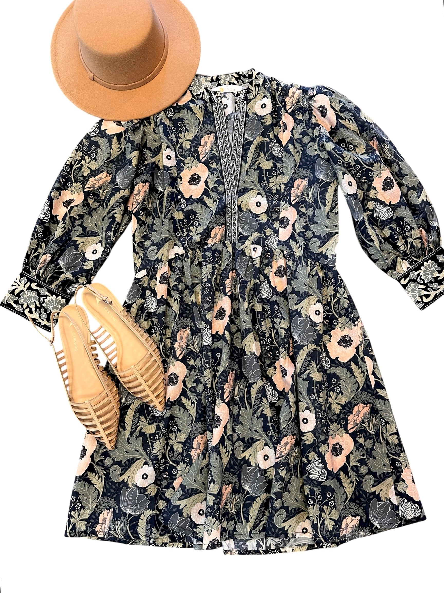 A short and breezy dress for those warmer days. Step into boho chic style with the Leonor Dress by Bindu, designed for women who embrace vibrant trends. This long sleeve mini dress in a pretty moss floral print is crafted from 100% cotton, making it lightweight and perfect for transitional fall weather. The dress features an empire waist and v-neckline with contrasting color details on the neckline and cuffs. Ideal for a music festival, this piece promises both comfort and standout style.
