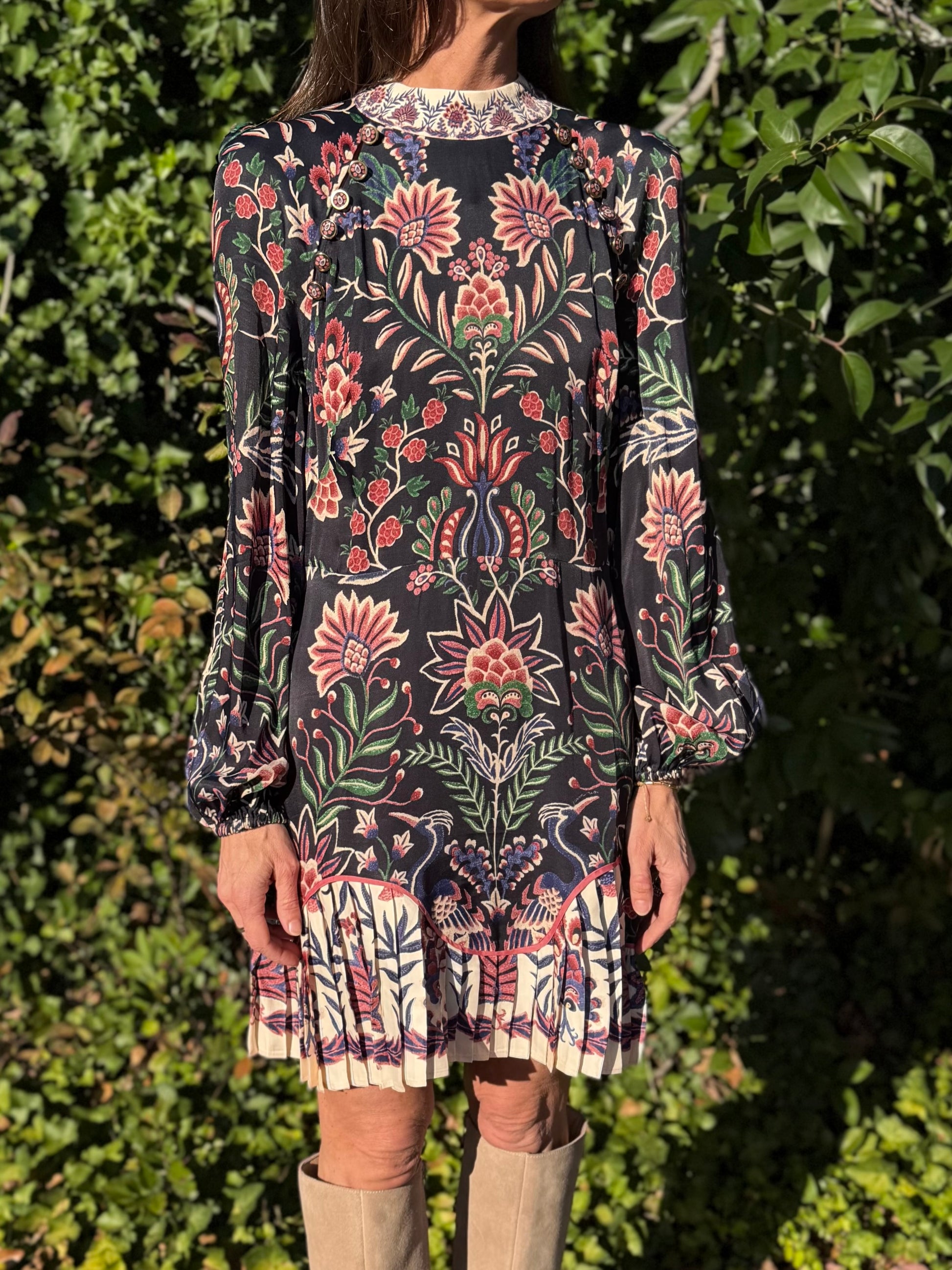 Embrace the enchanting allure of the Black Marvelous Garden mini dress, crafted from eco-responsible Lenzing Ecovero viscose. Its high neckline and softly gathered balloon sleeves frame a vibrant botanical print bursting with rich hues of green, pink, and blue. The flared silhouette ends in delicate pleats, adding graceful movement and a playful touch, while subtle gold ring details elevate its feminine charm with a warm, artful spirit.