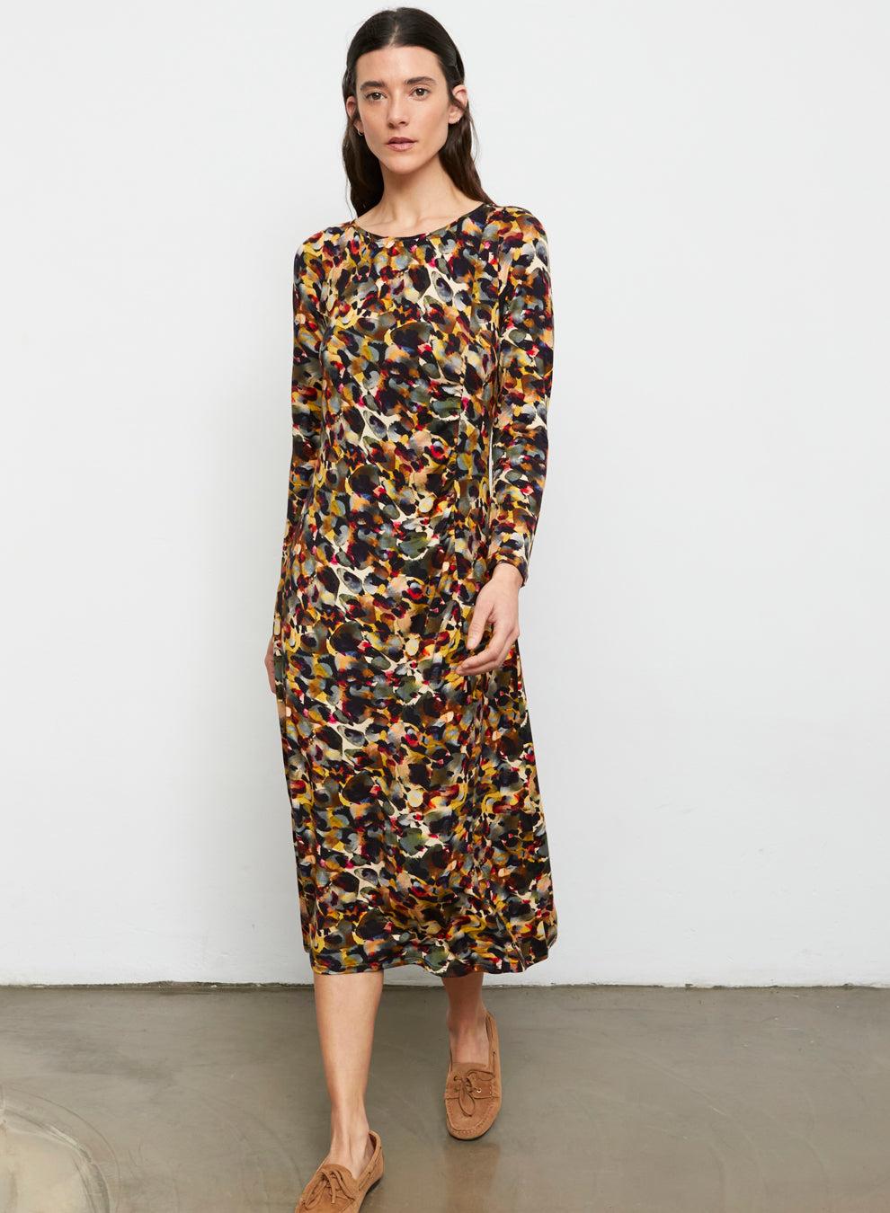 Elevate your wardrobe with the Hera Printed Jersey Dress in khaki by Aldo Martins. Featuring an abstracted animal print, long sleeves, and a flattering midi length, this dress is perfect for effortless layering and seamless transitioning between seasons. Its soft jersey fabric ensures comfort while maintaining a chic, modern look that stands out. Ideal for day-to-night wear, the Hera dress combines style and versatility to keep you confident and comfortable wherever you go.