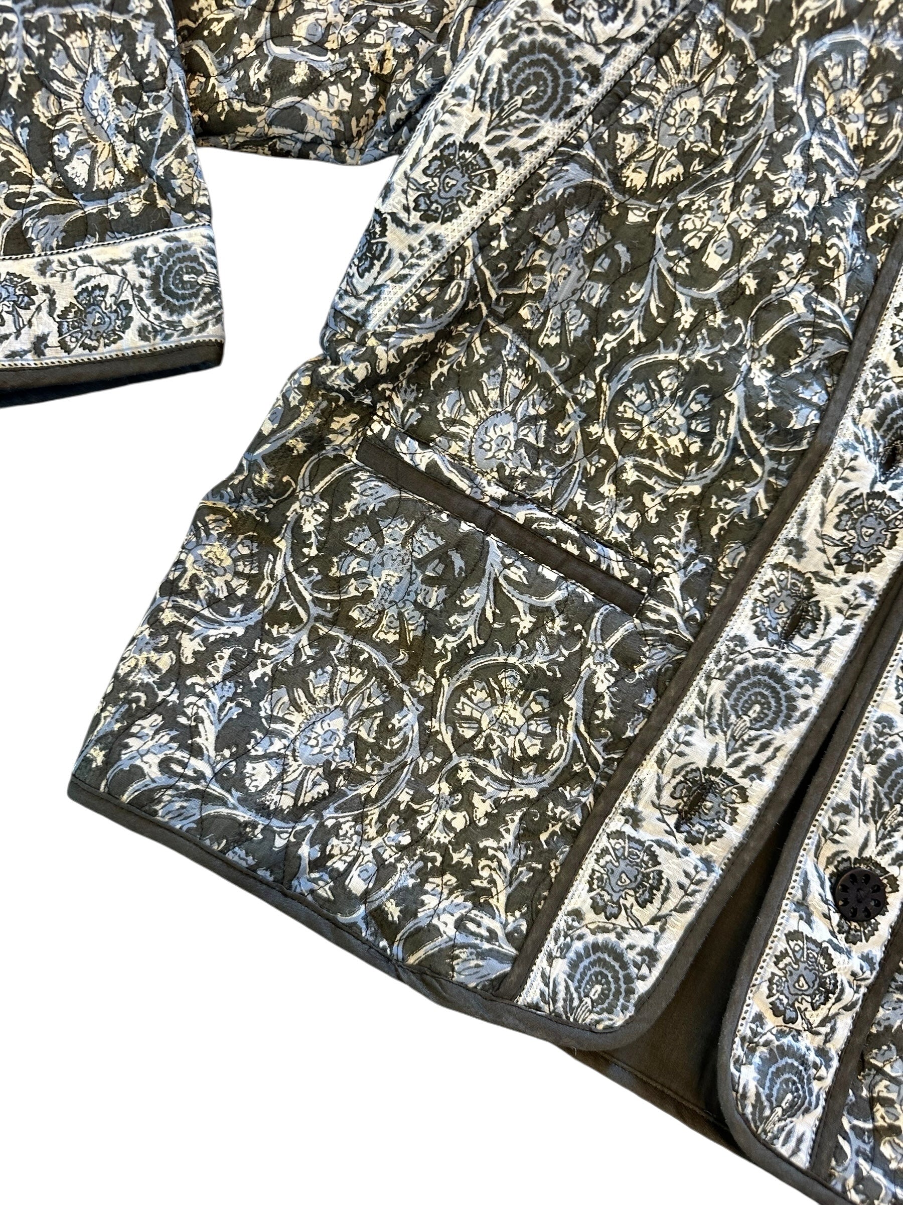 Cut in cotton dobby, textured yet soft to the touch, padded for light structure and warmth. The colour rests steady, neither dark nor bright, like a storm held at pause.