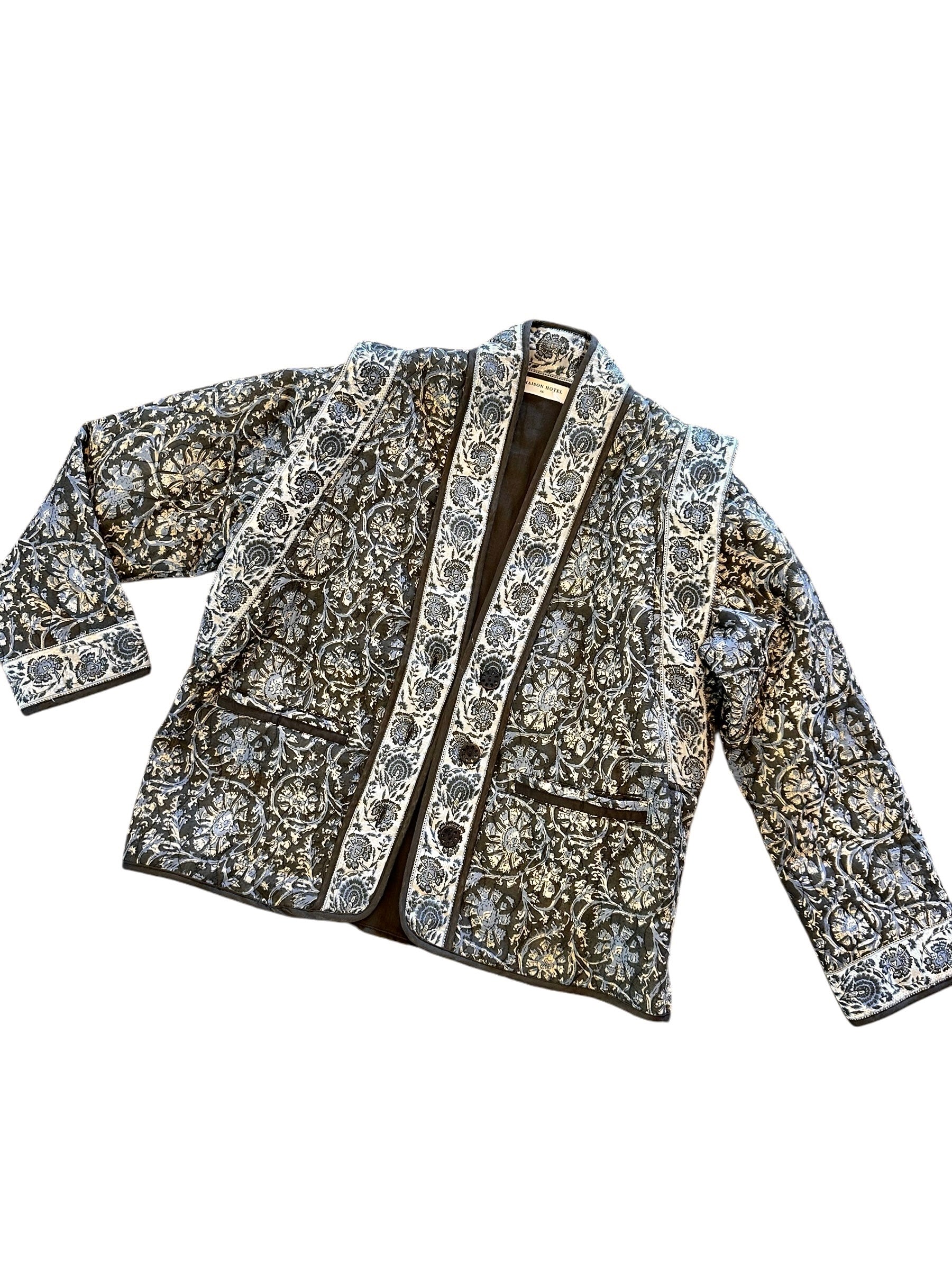 The jacket is long-sleeved and lightly quilted, its front finished with buttons, while the shoulders carry subtle contrast detailing. These quiet details balance its relaxed silhouette with crafted precision.