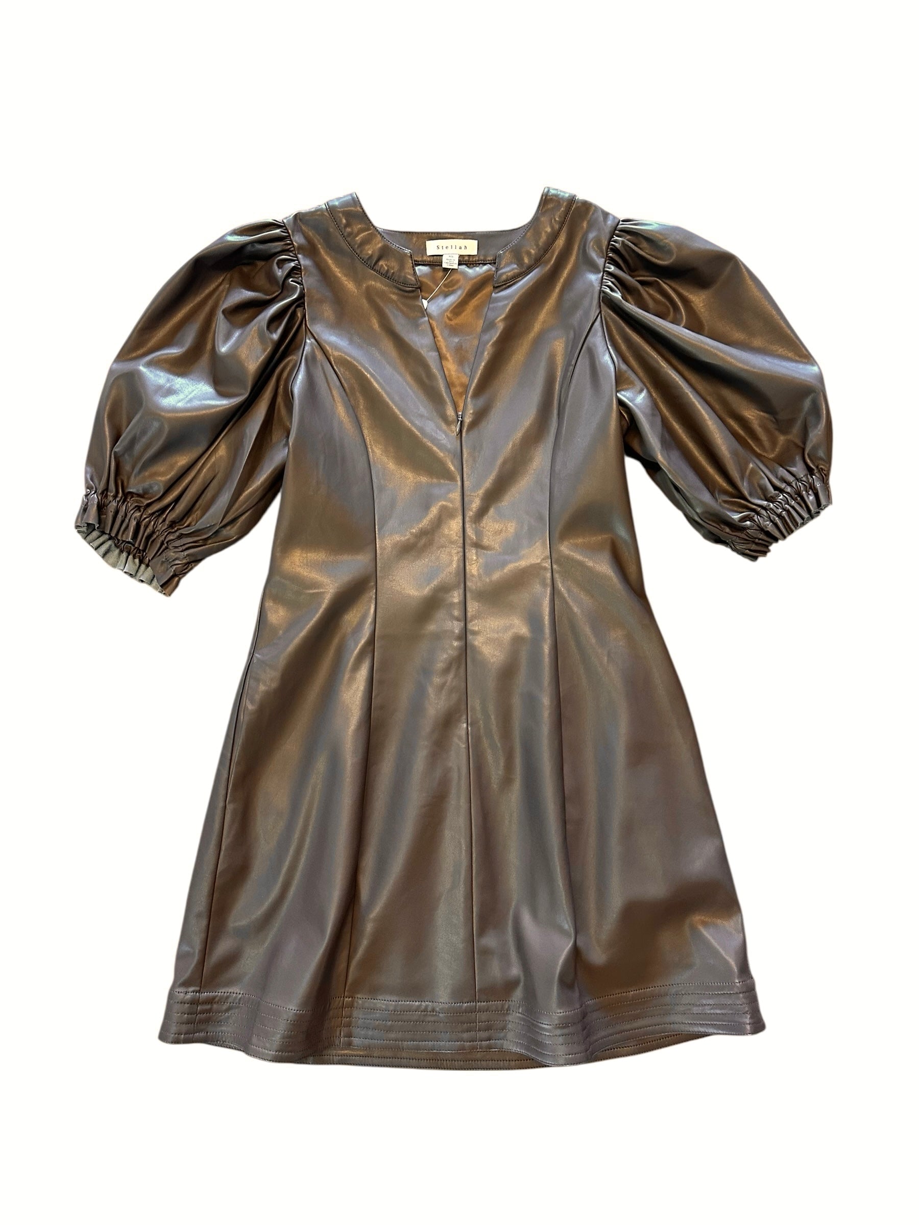 Vegan Leather Split Neck Puff Sleeve Dress in chocolate by Stellah